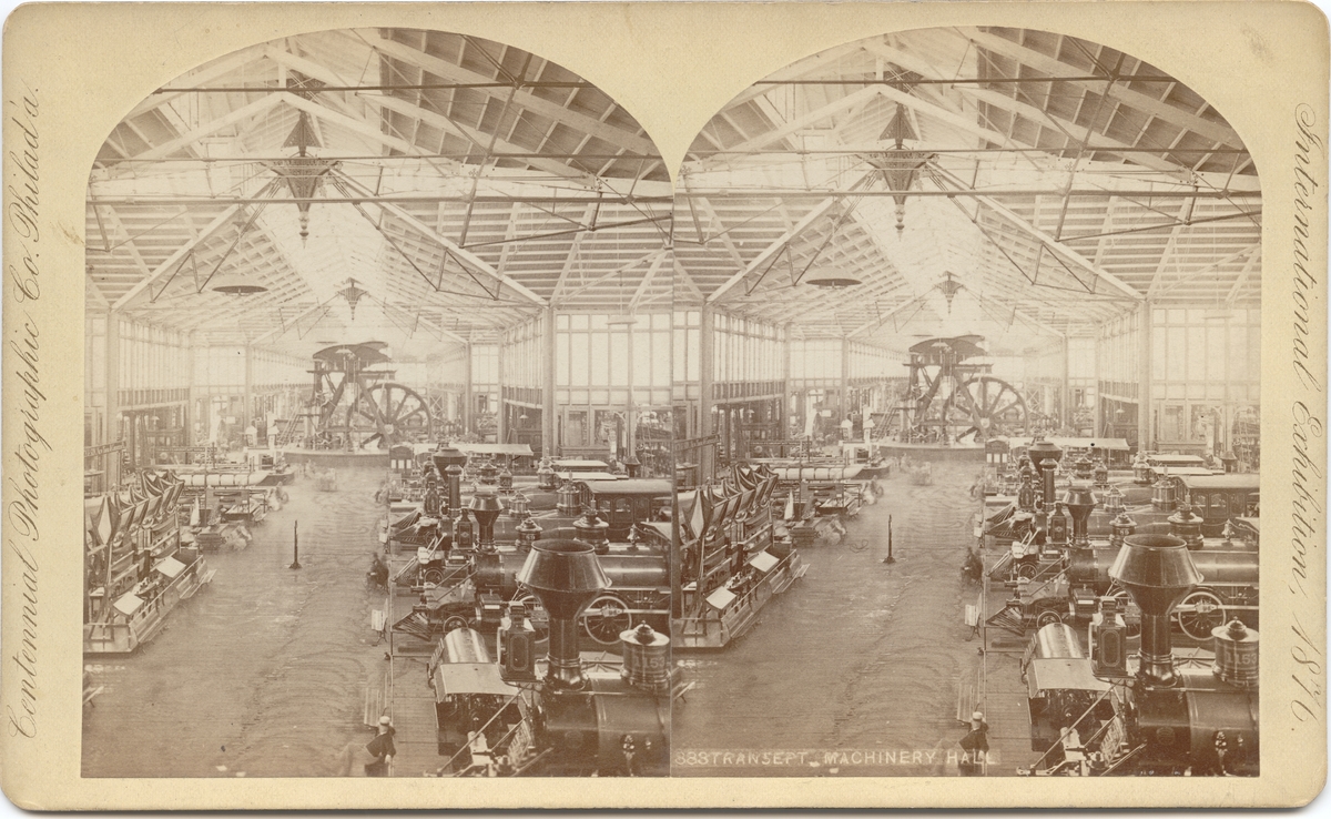Stereobild med motiv av maskinhallen i Världsutställningen i Philadelphia 1876.