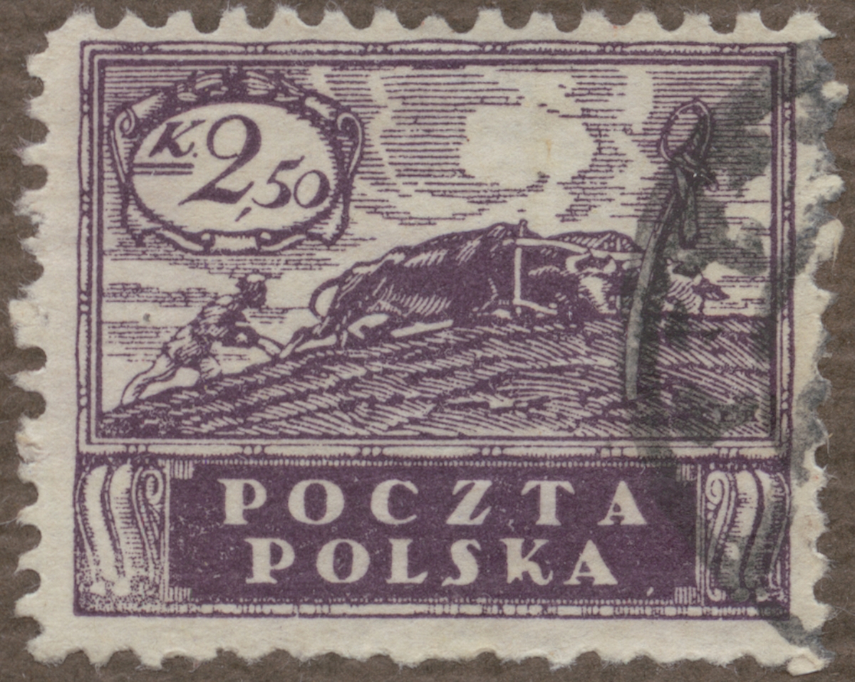 Frimärke från Polen, 1919. Motiv av Plöjningsarbete med oxspann