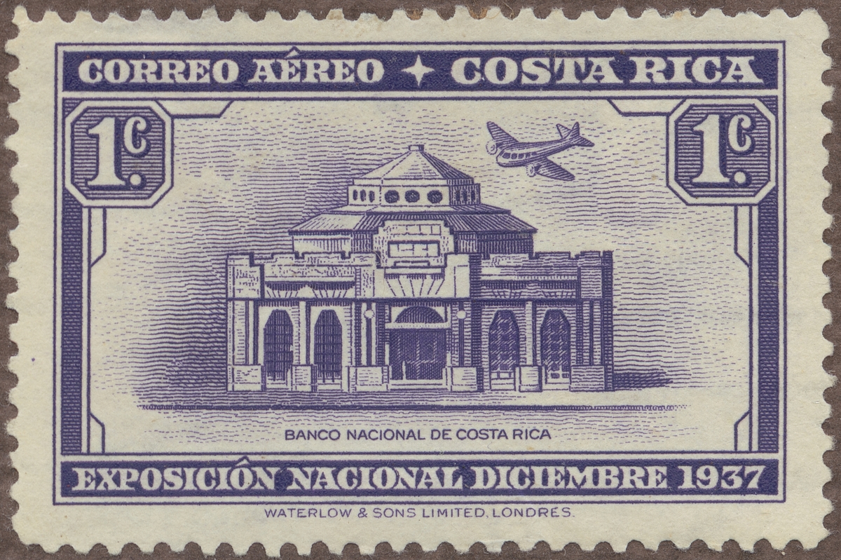 Frimärke från Costa Rica, 1937. Motiv av Monoplan över Nationalbanken i Costa Rica "Nationalutställning dec 1937"