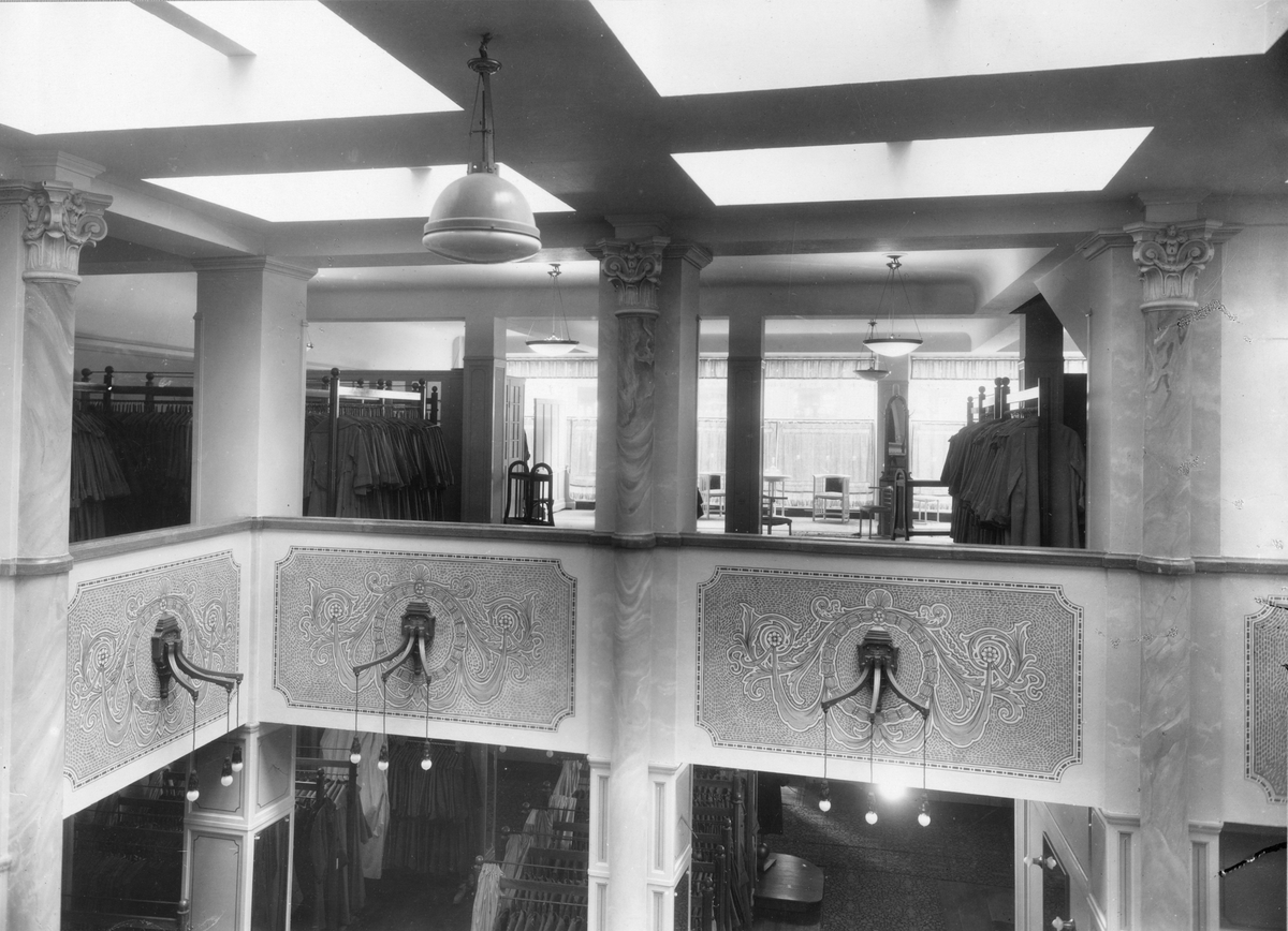 Arthur Ballin Kappfabrik på Regeringsgatan 33 i Stockholm. Kappavdelningens nedre botten och en trappa.