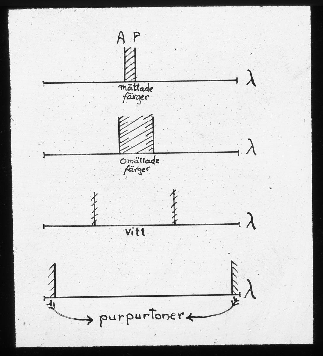 Skioptikonbild från institutionen för fotografi vid Kungliga Tekniska Högskolan. Använd av professor Helmer Bäckström som föreläsningsmaterial. Bäckström var Sveriges första professor i fotografi vid Kungliga Tekniska Högskolan 1948-58. Motiv föreställande "Additiv blandning av två spektralfärger". (För mer text se bilden) För mer info se: Bäckström, Helmer. Fotografisk Handbok. andra omarbetade upplagan. Natur och Kultur. Stockholm. 1948-59. Kap. 128 Trikolorimetri s. 958 och följande.