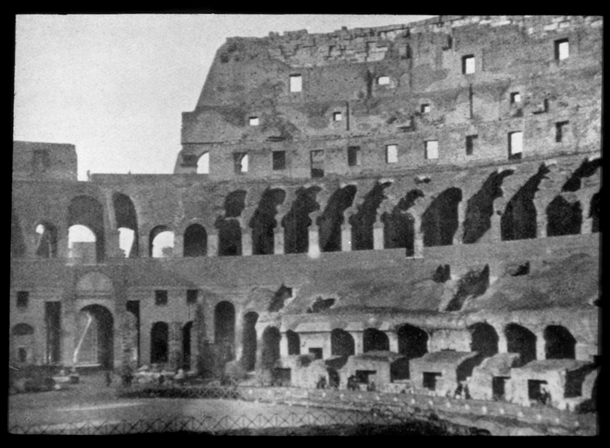 Skioptikonbild från institutionen för fotografi vid Kungliga Tekniska Högskolan. Motiv föreställande Colloseum i Rom, Italien..Bilden är troligen tagen av John Hertzberg under en resa i Europa.