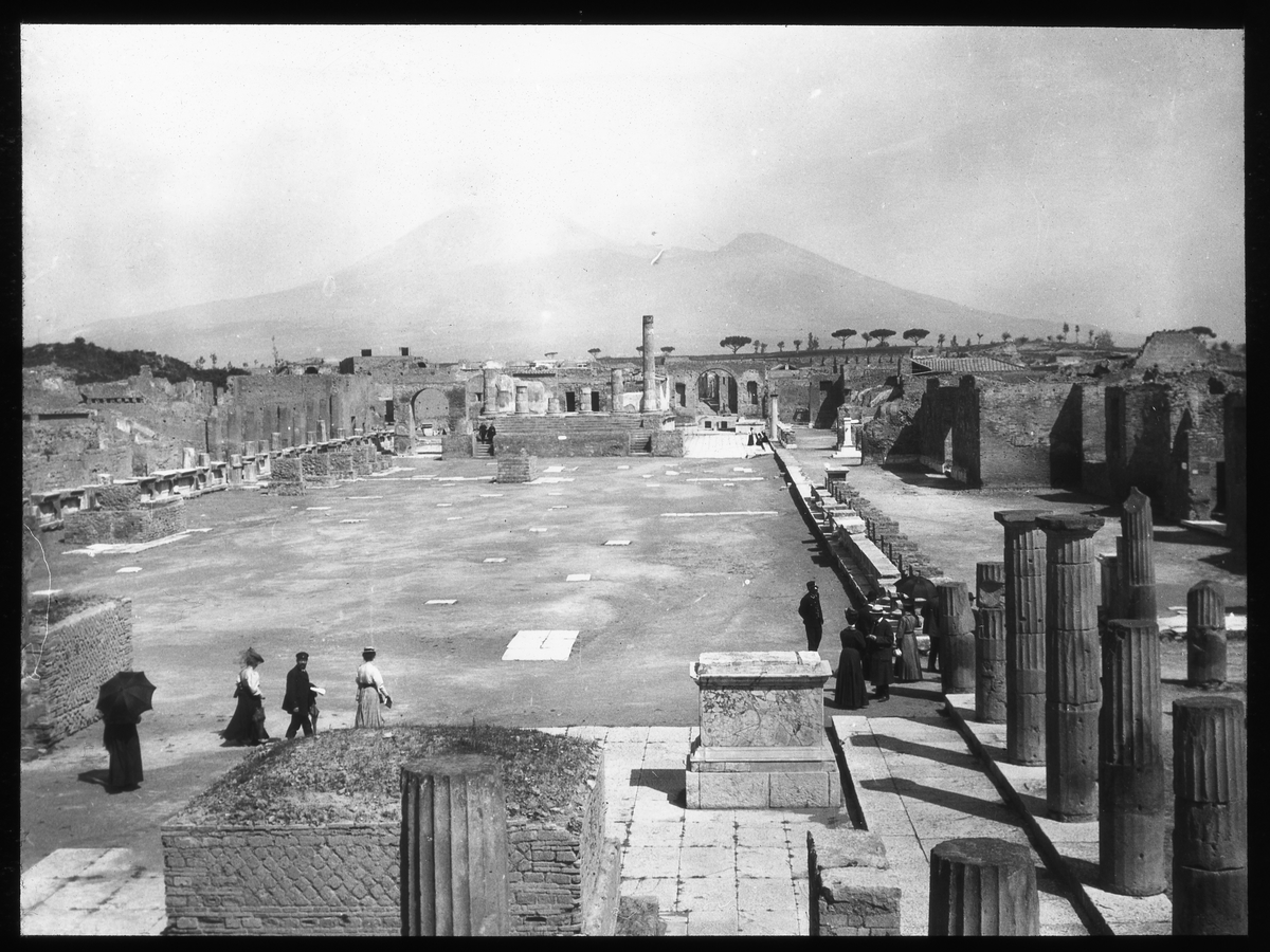 Skioptikonbild från institutionen för fotografi vid Kungliga Tekniska Högskolan. Motiv från staden Pompeji. Vesuvius i bakgrunden. Bilden är troligen tagen av John Hertzberg under en resa i Europa.