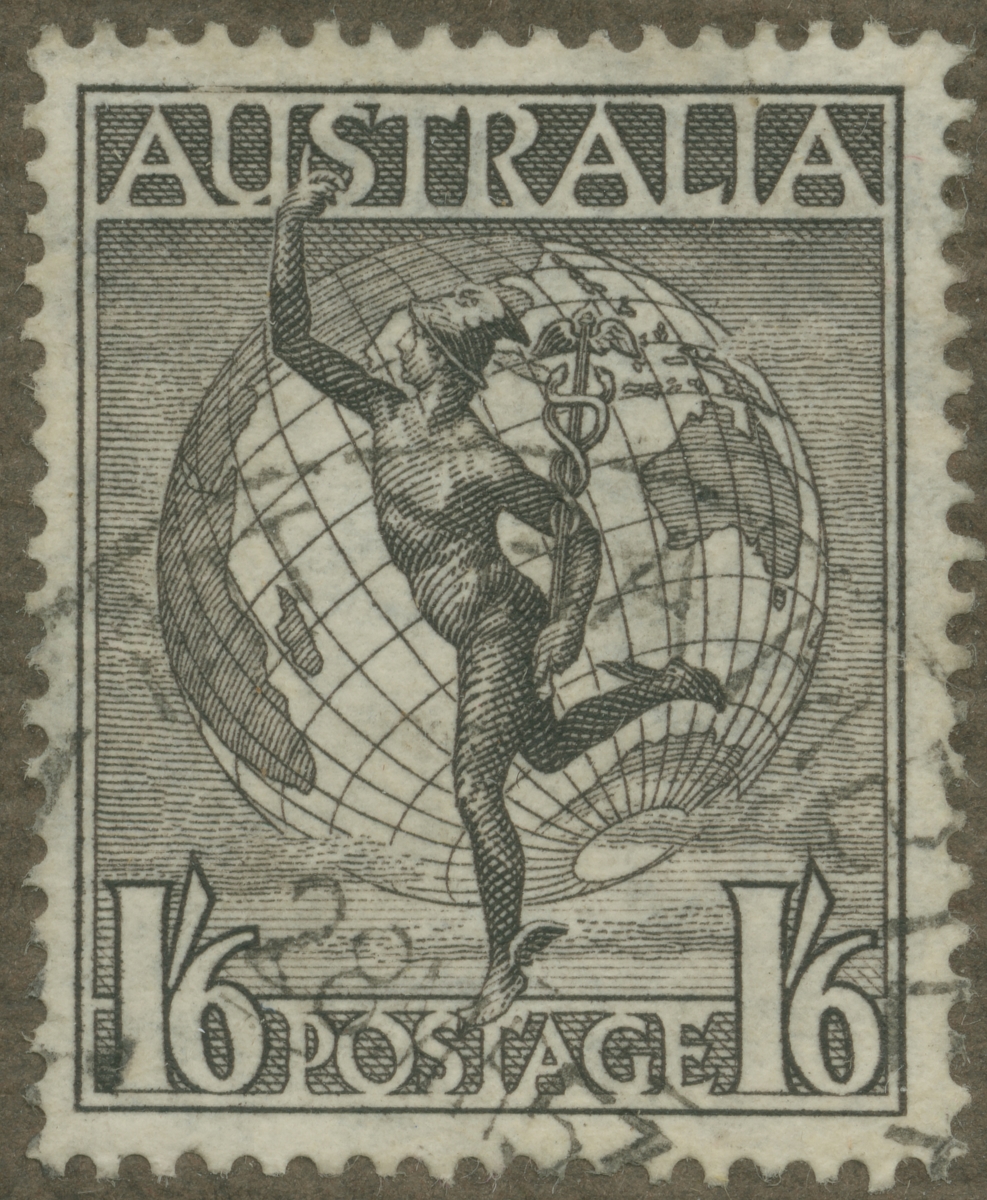 Frimärke från Australien, 1949. Motiv av Mercurius mot bakgrunden av en jordglob. "Symbol för världsposten. Världspostföreningens 75-årsjubileum".