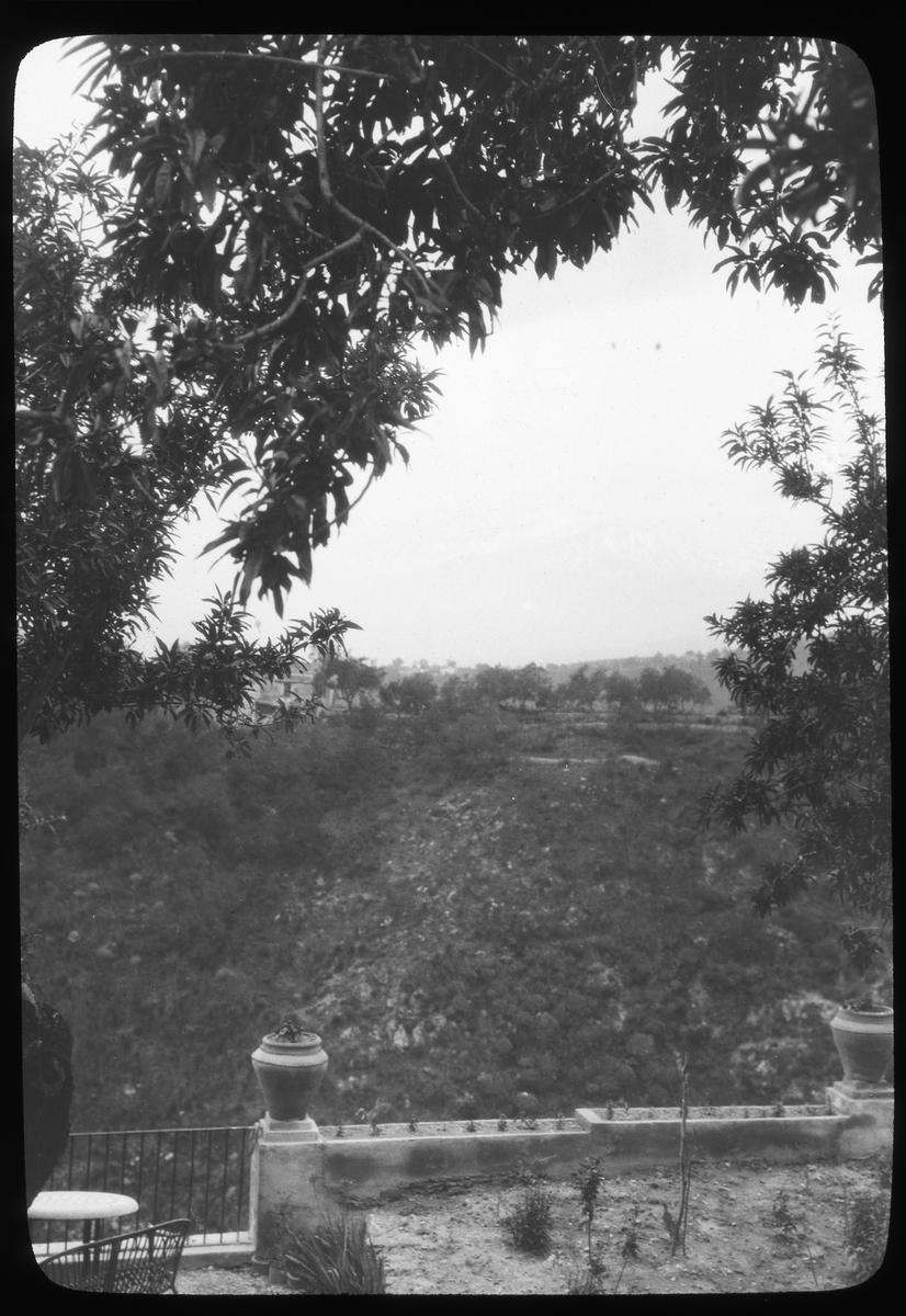 Skioptikonbild från institutionen för fotografi vid Kungliga Tekniska Högskolan. Bilden är troligen tagen av John Hertzberg under en resa i Europa. Hertzberg blev docent i fotografi 1921vid Kungliga Tekniska Högskolan i Stockholm. Vy över landskap.