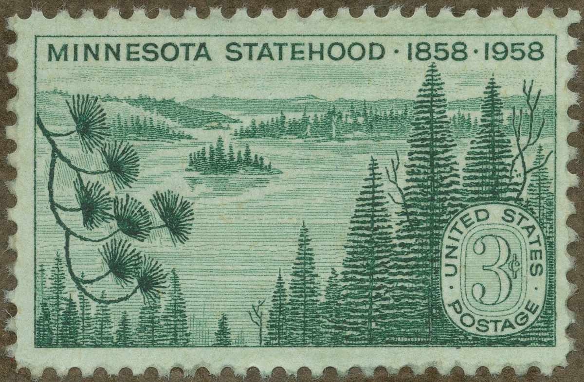 Frimärke ur Gösta Bodmans filatelistiska motivsamling, påbörjad 1950. Frimärke från U.S.A., 1958. Motiv av Stiliserat flodlandskap "100-årsminne av Minnesotas statsrättigheter. 1858-1958"
