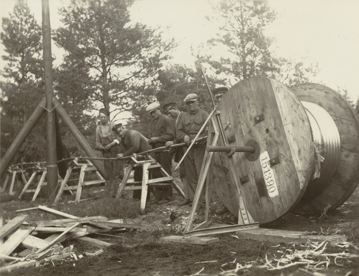 Hjälmsätrakabeln. Påhankning utfört av Lf Gustafssons lag. Ur albumet Kabelarbetet. Hjälmsälra - Norrtälje - Finnviken utfört under sommaren 1928.
