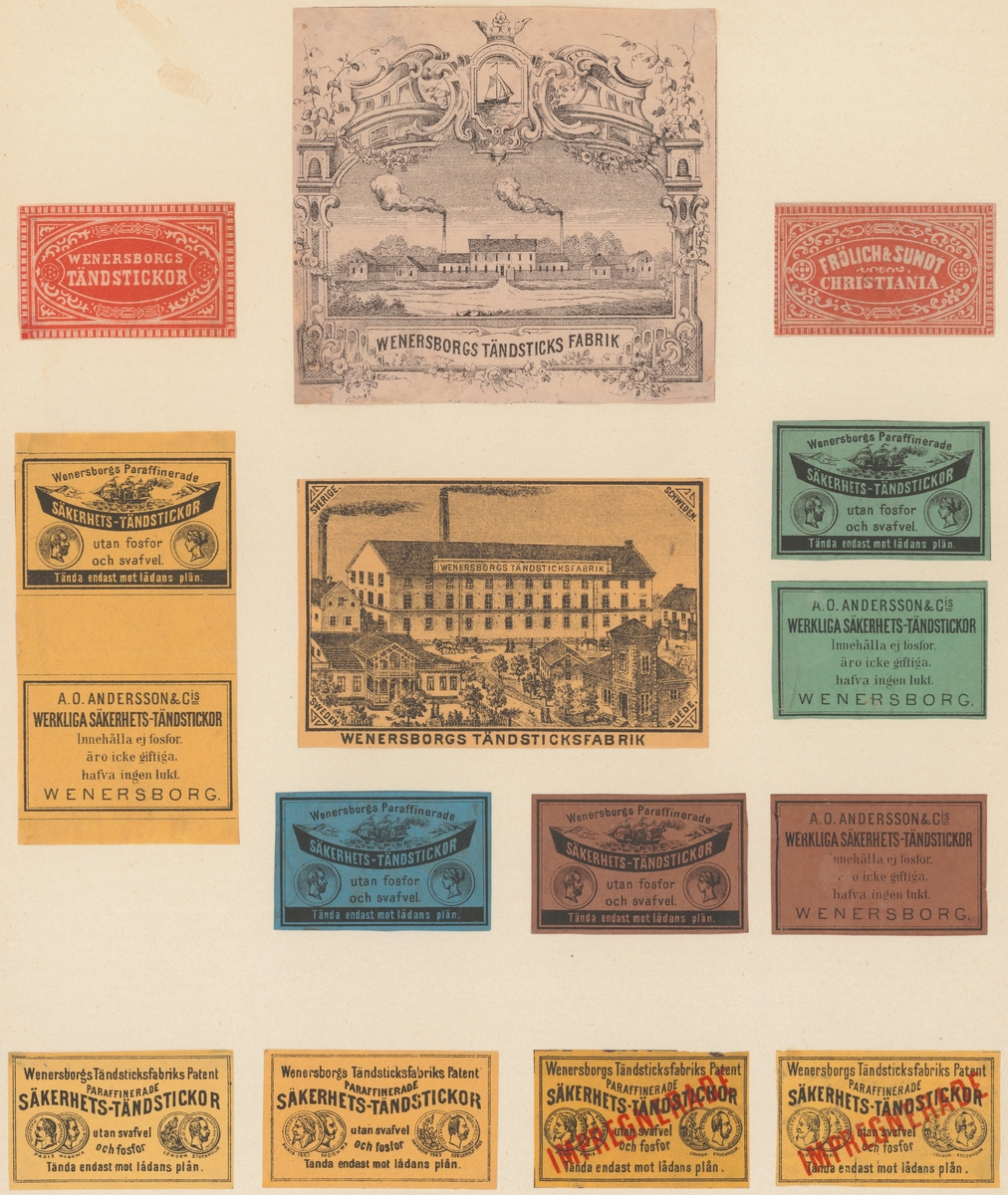 Etiketter för tändsticksaskar, från Svenskt Industri- och Handelsmuseum.