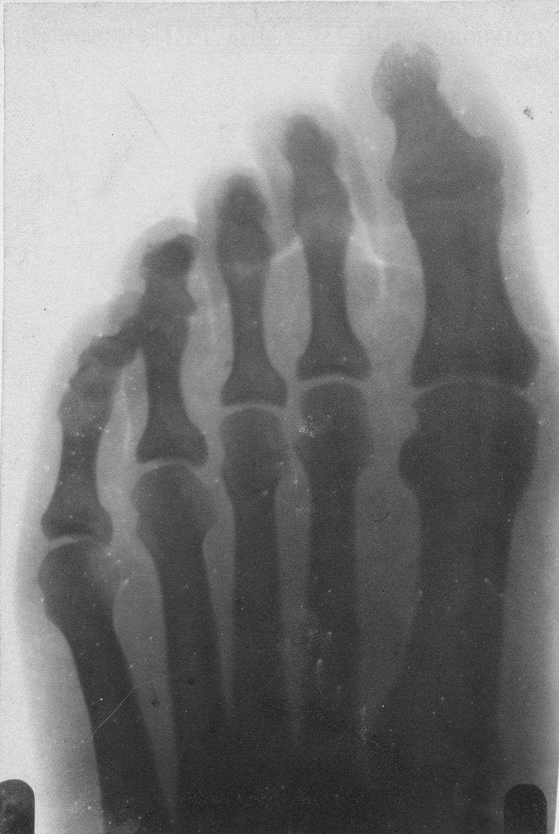 Röntgenfotografi av Harald Wadströms högra fot. Röntgenfotograferad av Dr. Hjalmar Schulzberg 1896.