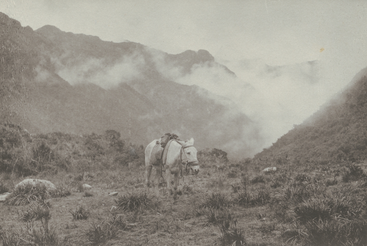 Fotografi från kuvert märkt med "Ernst Nordenskjöld". Motiv av häst i ett dimtäckt bergslandskap.