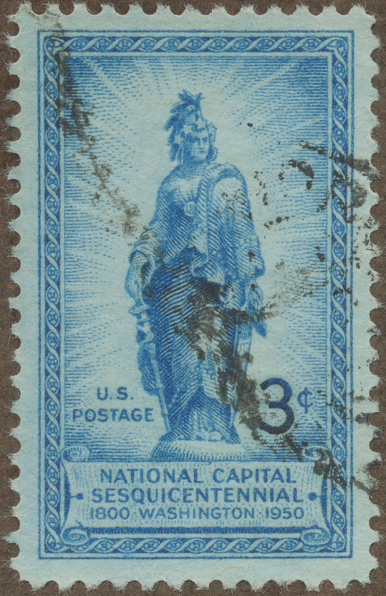 Frimärke från U.S.A., 1950. Motiv av Frihetsstatyen på Capitoleum kupolen: symbol för frihet -"Serie: USA:s huvudstad Washington 150 år". 1800-1950.
