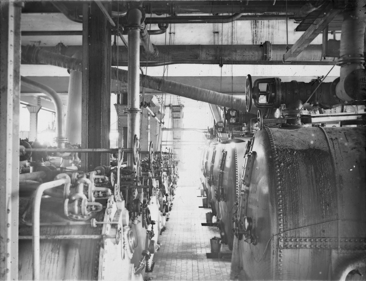Titel: Skioptikonbild med motiv från yrkesinspektionens undersökningar på olika arbetsplatser. Okänd sockerfabrik. Beredning av sockerbeta.