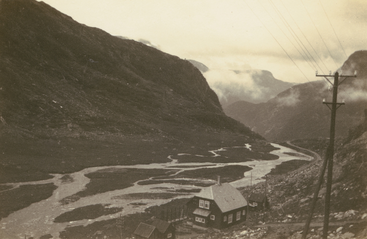 Fotografi från Albin Ahrenbergs resa till Grönland 1929. Vy över kargt bergslandskap. I förgrunden syns ett hus och telefonstolpe.