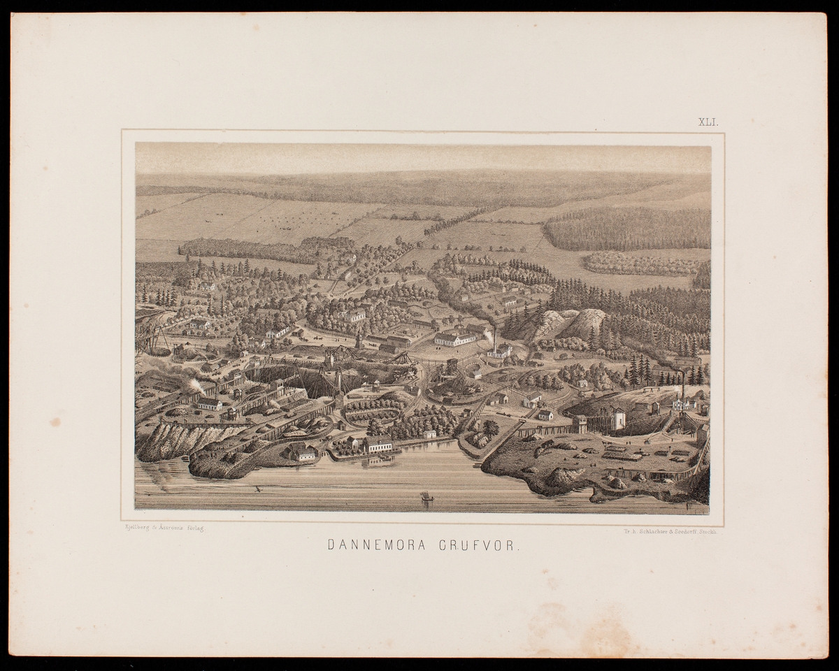 Litografi. Tyckt bild med motiv av Dannemora gruva. Tryckt av Kjellberg & Åström förlag.