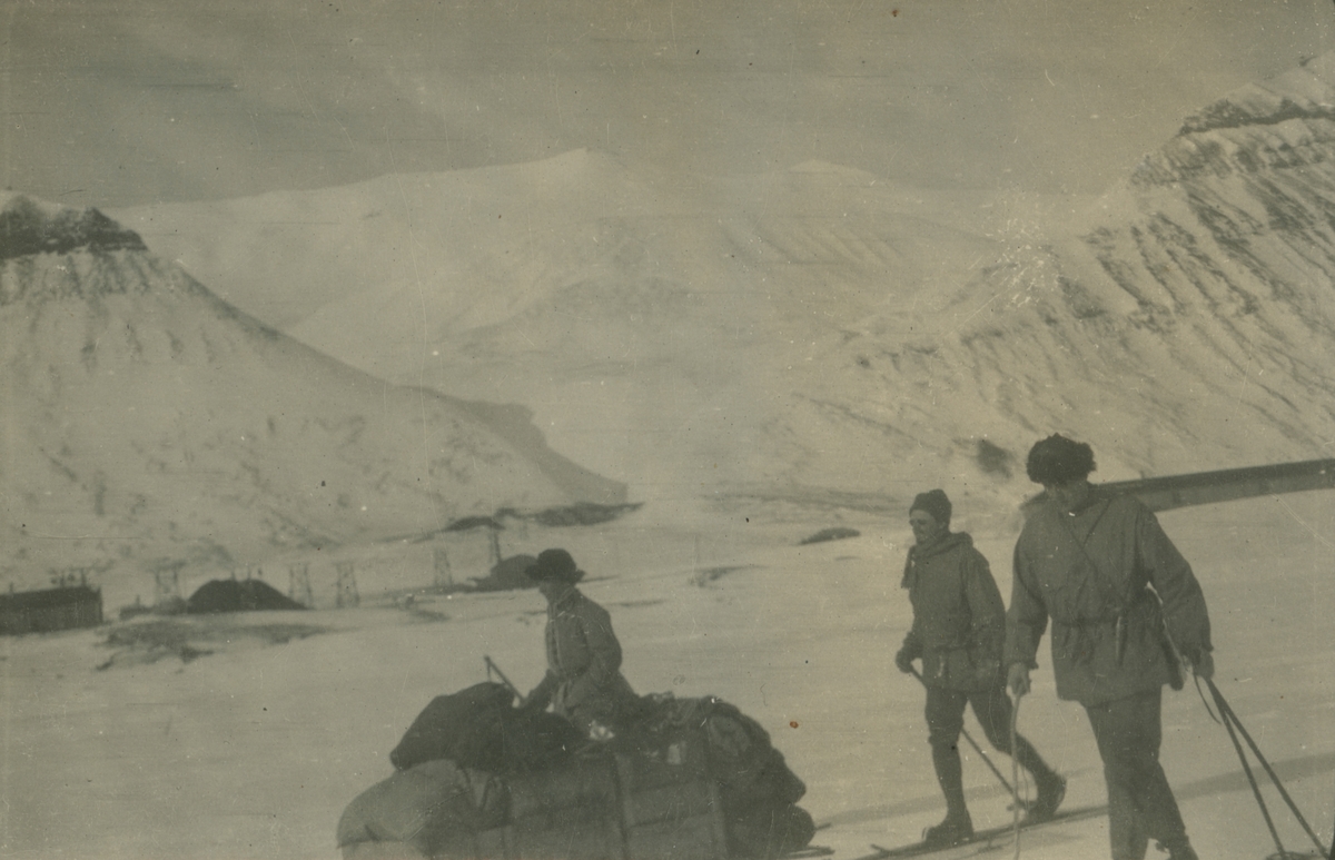 Fotografi från expedition till Spetsbergen. Motiv av tre expeditionsdeltagare på skidor i ett snötäckt bergslandskap.
