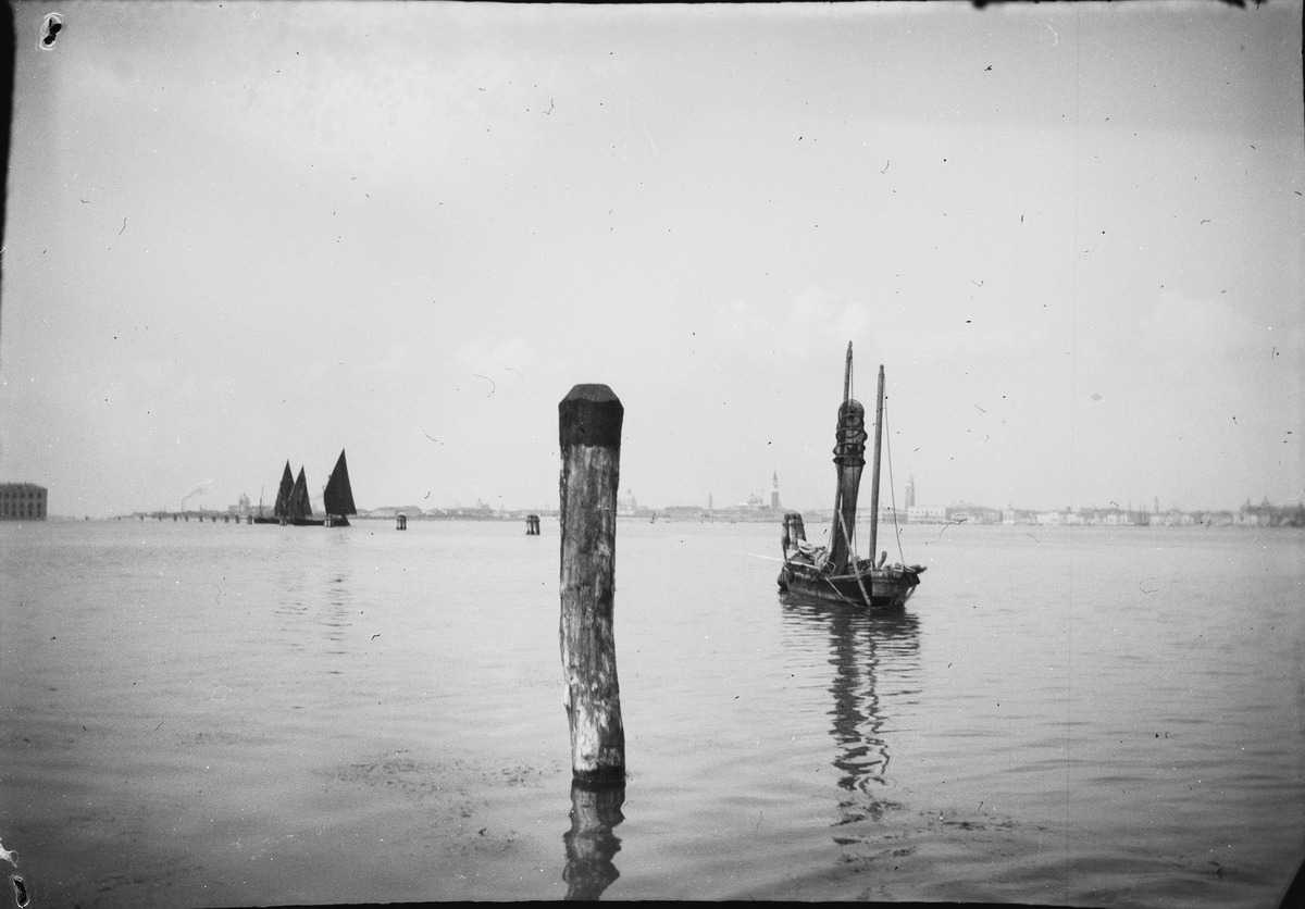 Drottning Victoria bilder. Båt med upphängda fiskenät i masten ute på vattnet.