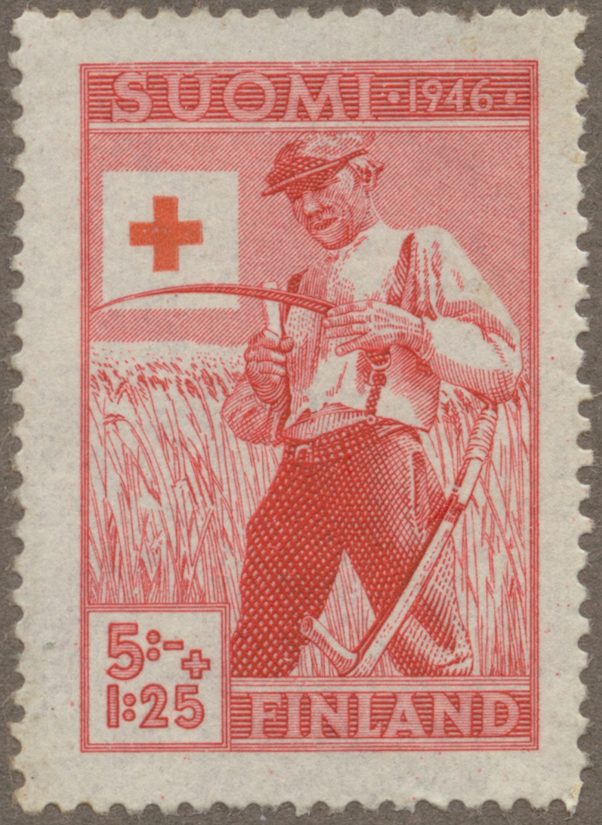Frimärke från Finland, 1946. Motiv av Finsk sädesskördning. Lantbrukare med lie. "Röda-kors-serie."
