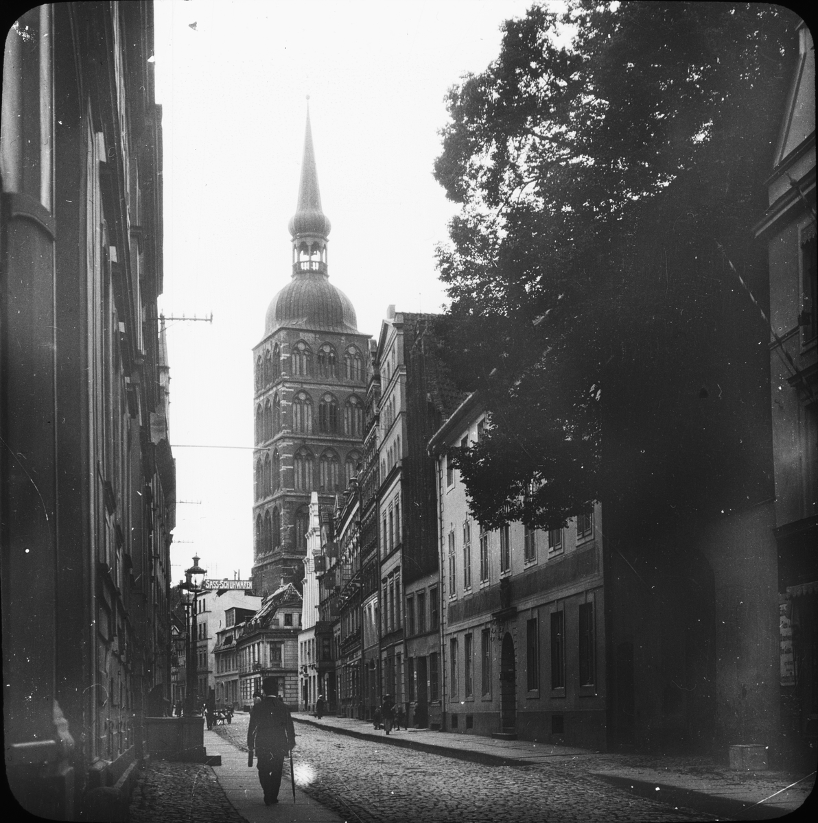Skioptikonbild med motiv från Baden strasse i Stralsund. I bakgrunden syns St. Nikolai Kirche.
