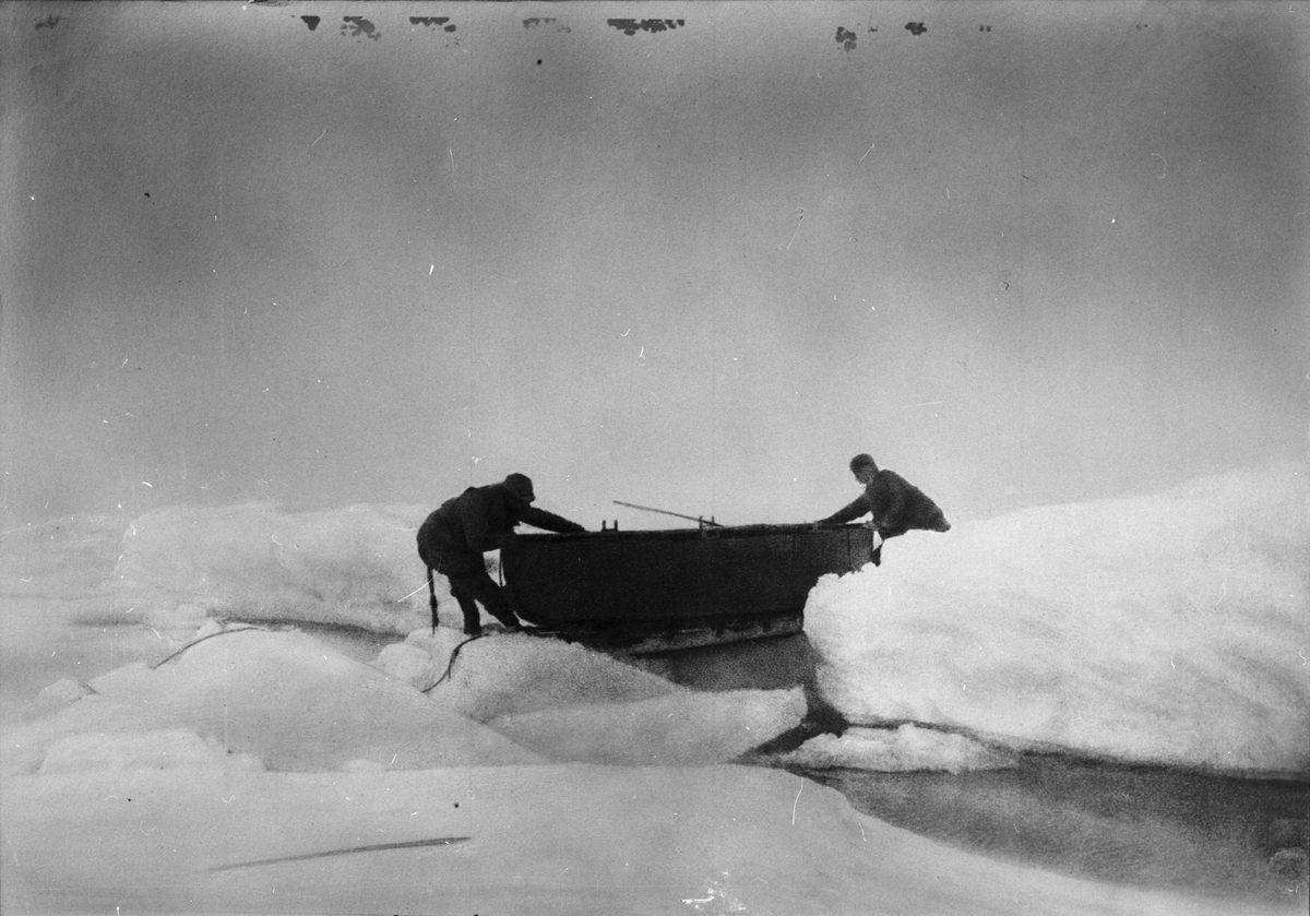 Fraenkels kälke drages fram med båten mellan isblocken. Till höger Andrée, till vänster Fraenkel. Framtagning av bilderna gjordes av docent John Hertzberg år 1930 på Fotografi, Tekniska Högskolan.