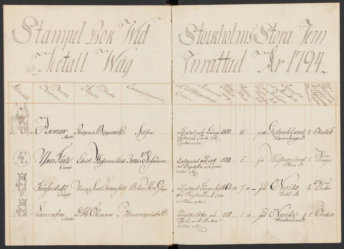 Titel: Stämpelbok vid Stockholms stora järn- och metallvåg inrättad år 1794. Handskrift. Ur Carl Sahlins bergshistoriska samling.