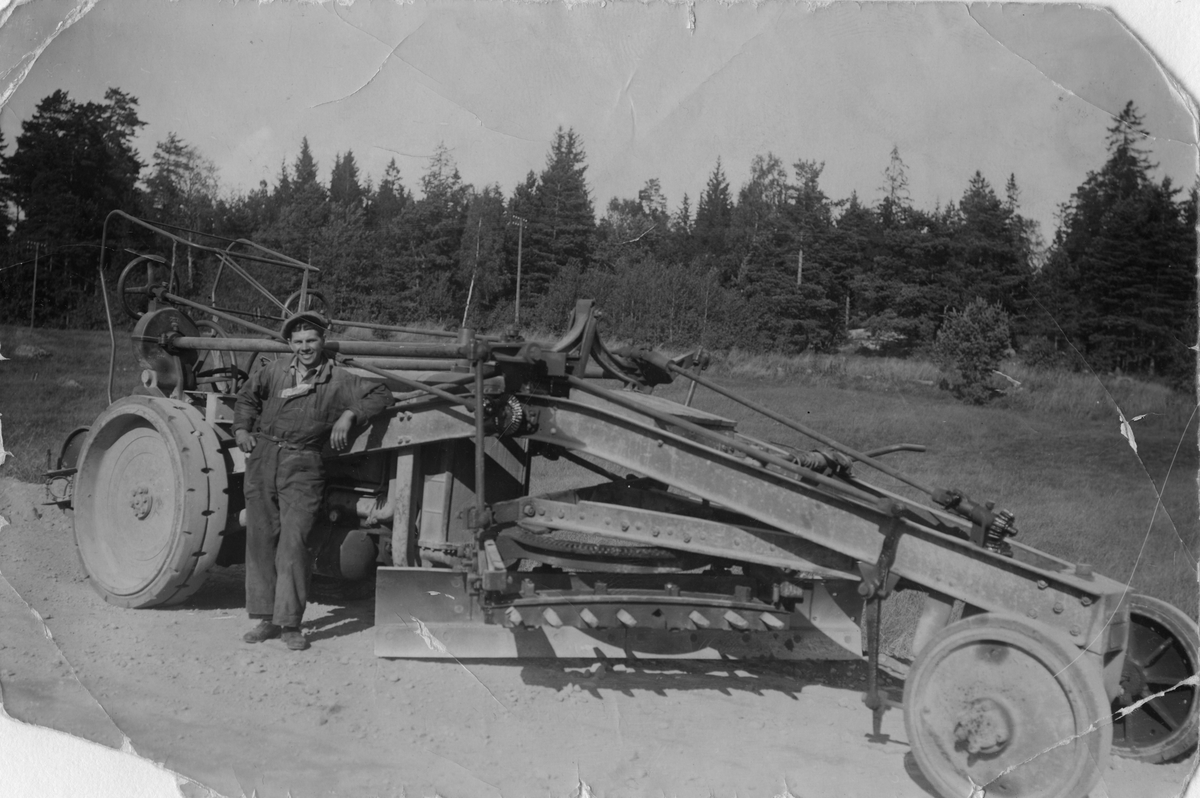 Stockholm Stads Gatukontors första väghyvel på Uppsalavägen 1932. Förare var Nils Bernzon.
