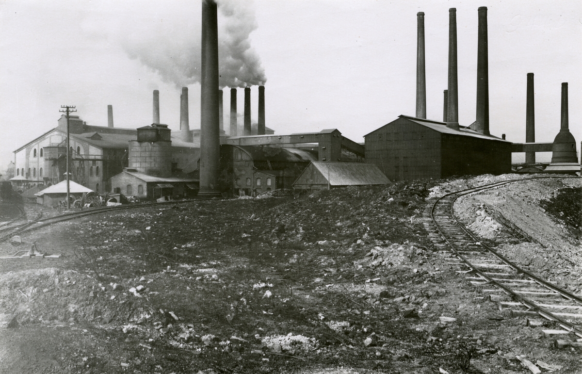 Limhamns Cementfabrik. Fabriken 1908-1914. Från vänster, roterugnar, ringugn och schaktyugnar.