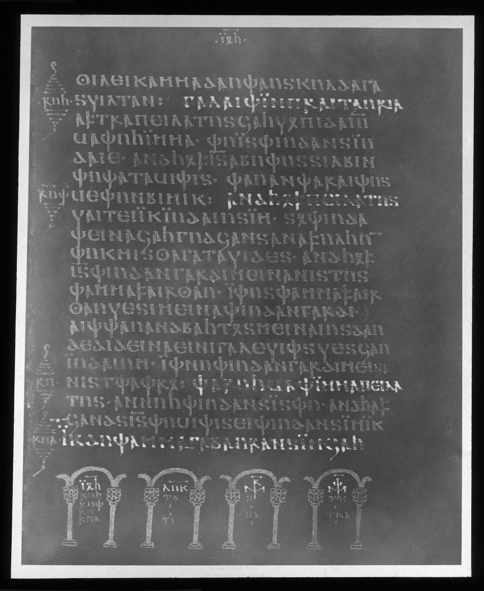 Skioptikonbild från institutionen för fotografi vid Kungliga Tekniska Högskolan. Använd av professor Helmer Bäckström som undervisningsmaterial. Bäckström var Sveriges förste professor i fotografi vid Kungliga Tekniska Högskolan 1948-1958. Bilden visar en sida i Codex Argentus (Silverbibeln) skriven på det numera utdöda språket gotiska från början av 500-talet. Ursprungligen hade Silverbibeln minst 336 blad men av dessa är 188 stycken kända. 187 av sidorna förvaras på Carolina Rediviva i Uppsala och det 188:e bladet återfanns 1970 och förvaras i domkyrkan i den tyska staden Speyer. (På bilden står skrivet Uffilebibeln, Upsala, Svedberg och Nordlund.)