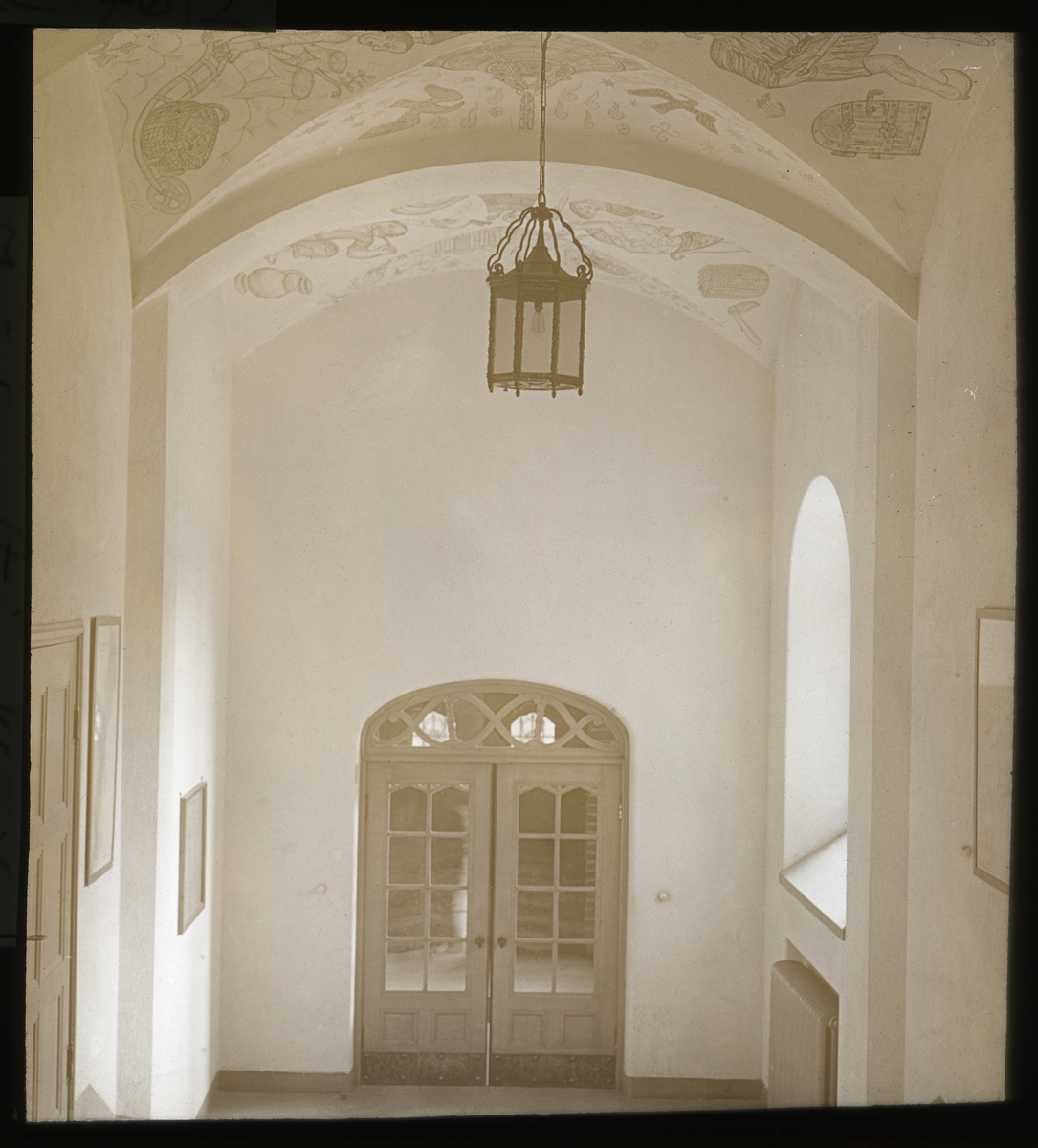 Skioptikonbild från institutionen för fotografi vid Kungliga Tekniska Högskolan. Använd av professor Helmer Bäckström som undervisningsmaterial. Bäckström var Sveriges förste professor i fotografi vid Kungliga Tekniska Högskolan 1948-1958. Trapphus. På bilden står skrivet: Indir. svaveltoning. Klorsilver. Eastman. För mer info: Se Fotografisk Handbok av Helmer Bäckström. Natur och Kultur. Andra omarbetade upplagan 1958-59. Kap 75-79 Toningsförfaranden för silverbilder (sid 585 och följande).