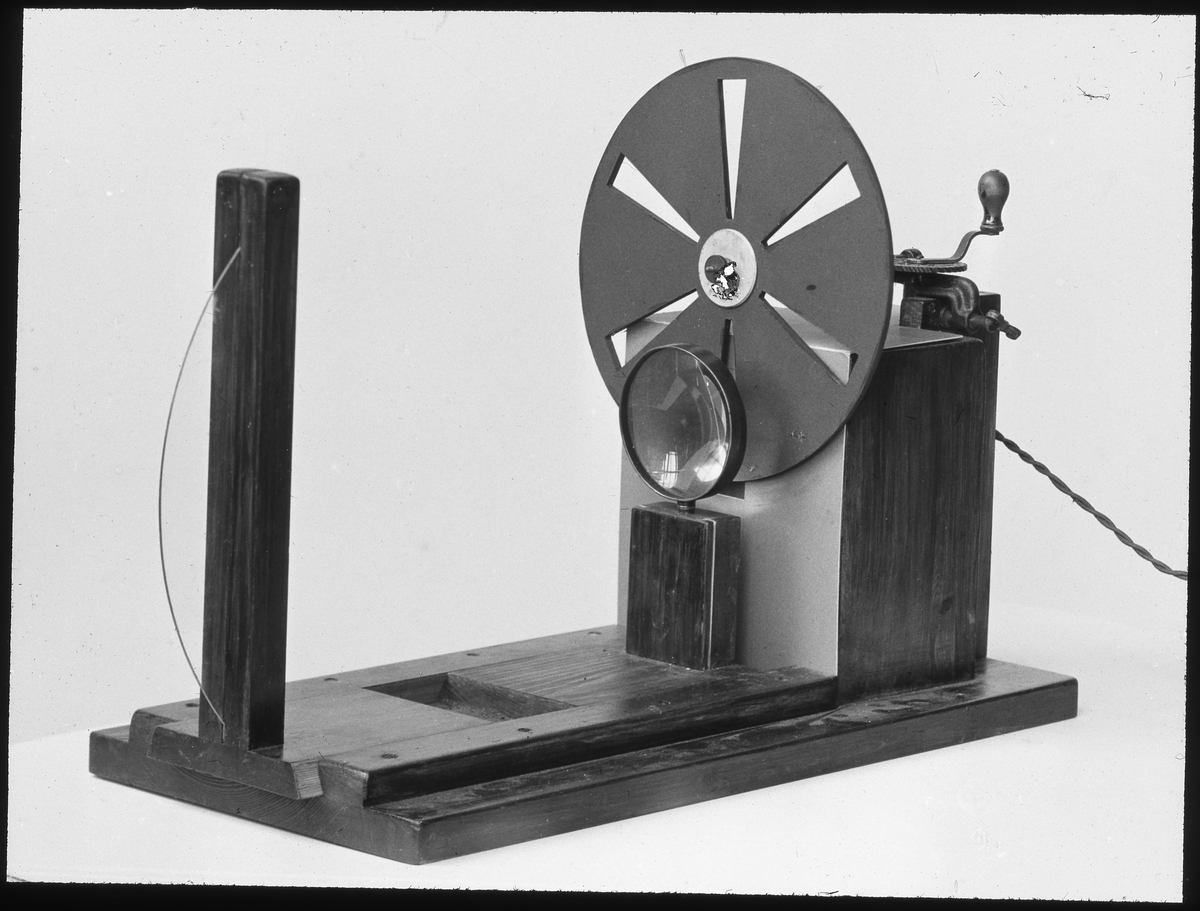 Apparatur för okänd typ av ljusexperiment. Troligen egen konstruktion. Skivan snarlik teknik för filmprojektion. Äldre typ av elkabel, textil.