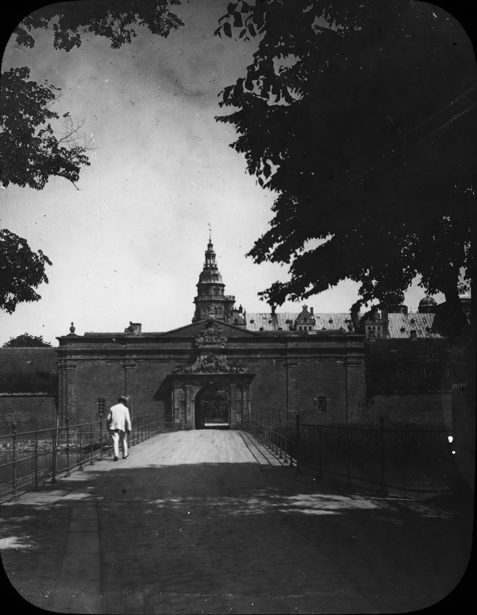 Skioptikonbild med motiv av man gående mot port i mren vid slottet Kronoborg i Helsingör.