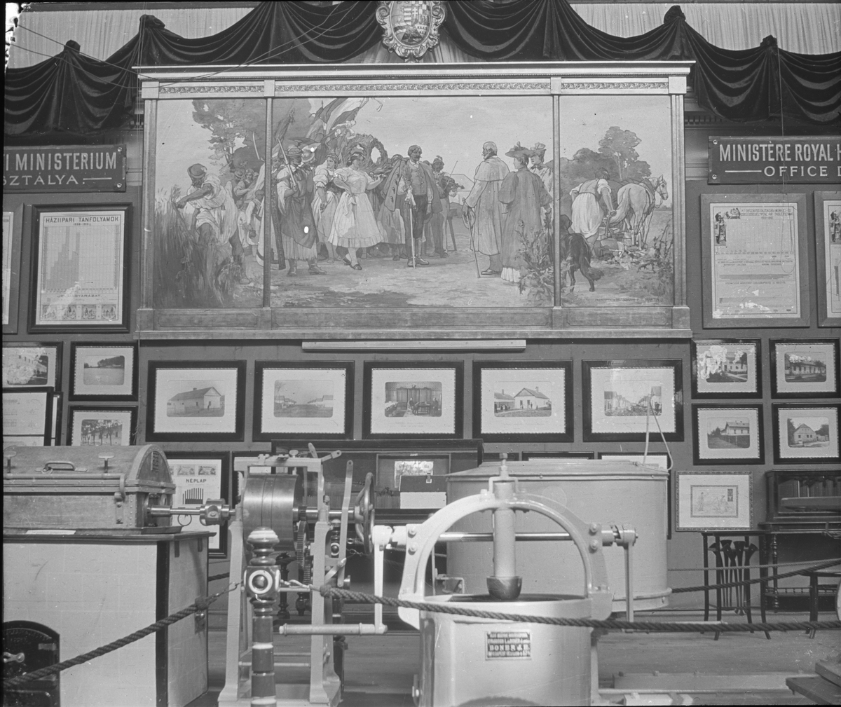 Skioptikonbild med motiv från yrkesinspektionens undersökningar på olika arbetsplatser. Okänd utställning.