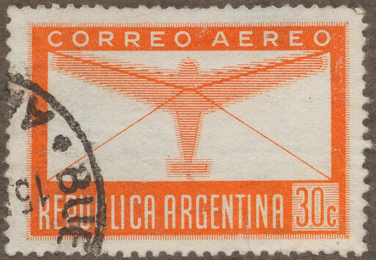 Frimärke från Argentina, 1940. Motiv av Stiliserat Monoplan på Brev symboliserande flygposten.
