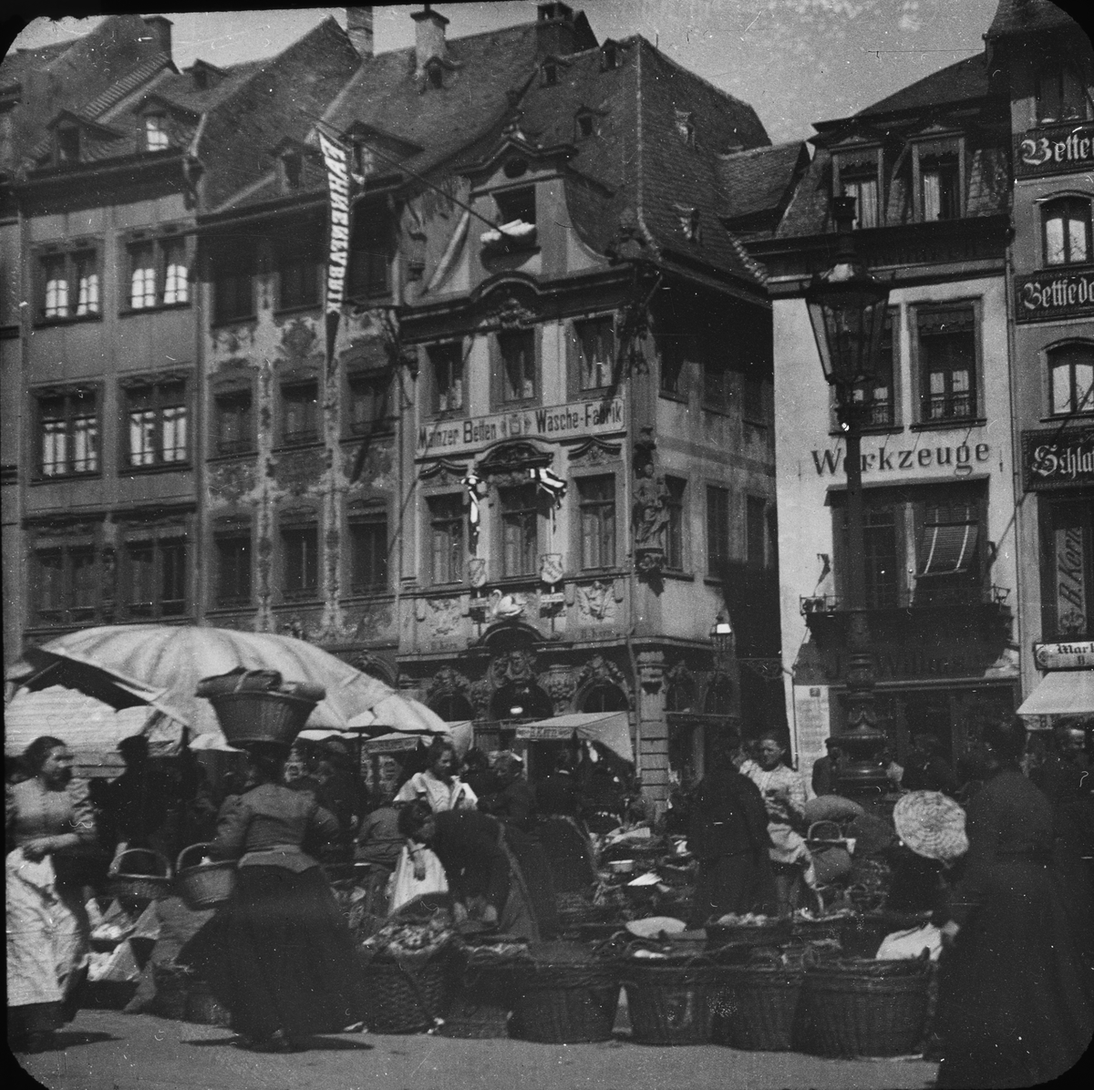 Skioptikonbild med motiv från marknadsplats i Mainz.
