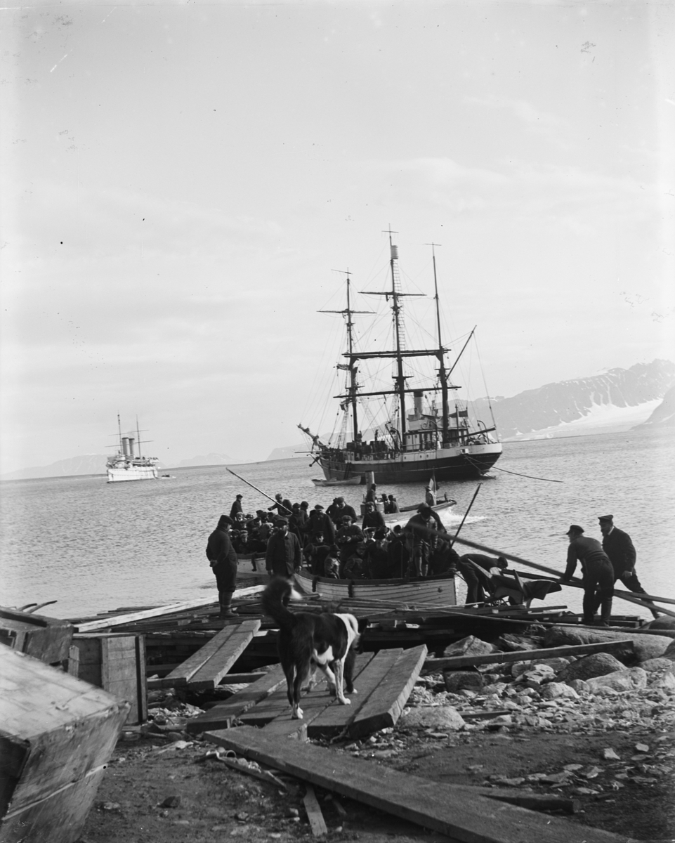 Fotografi från Spetsbergen. Motiv av män i båt vid hamn.