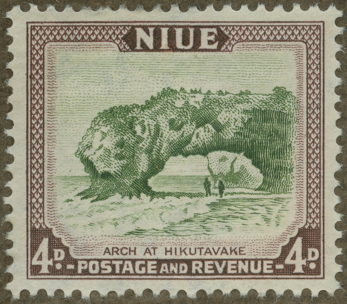 Frimärke ur Gösta Bodmans filatelistiska motivsamling, påbörjad 1950. Frimärke från Niue, 1950. Motiv av Klippbågen vid Hikutavake