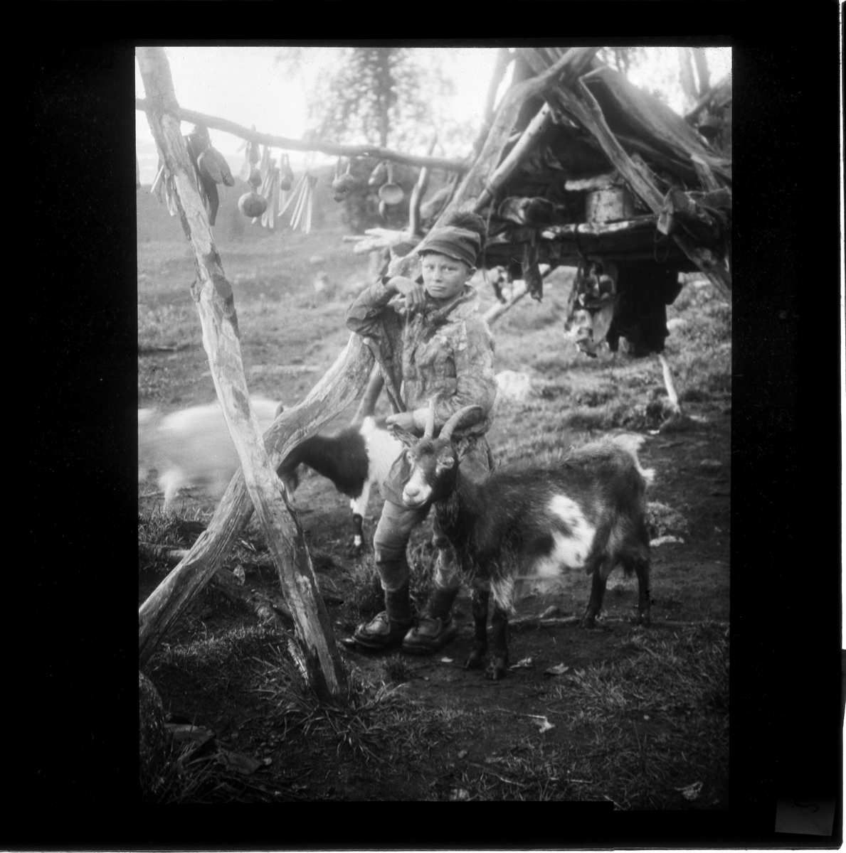Bild på samepojke med get. Troligen motiv taget av John Hertzberg på resa runt i Sverige kring sekelskiftet 1900.