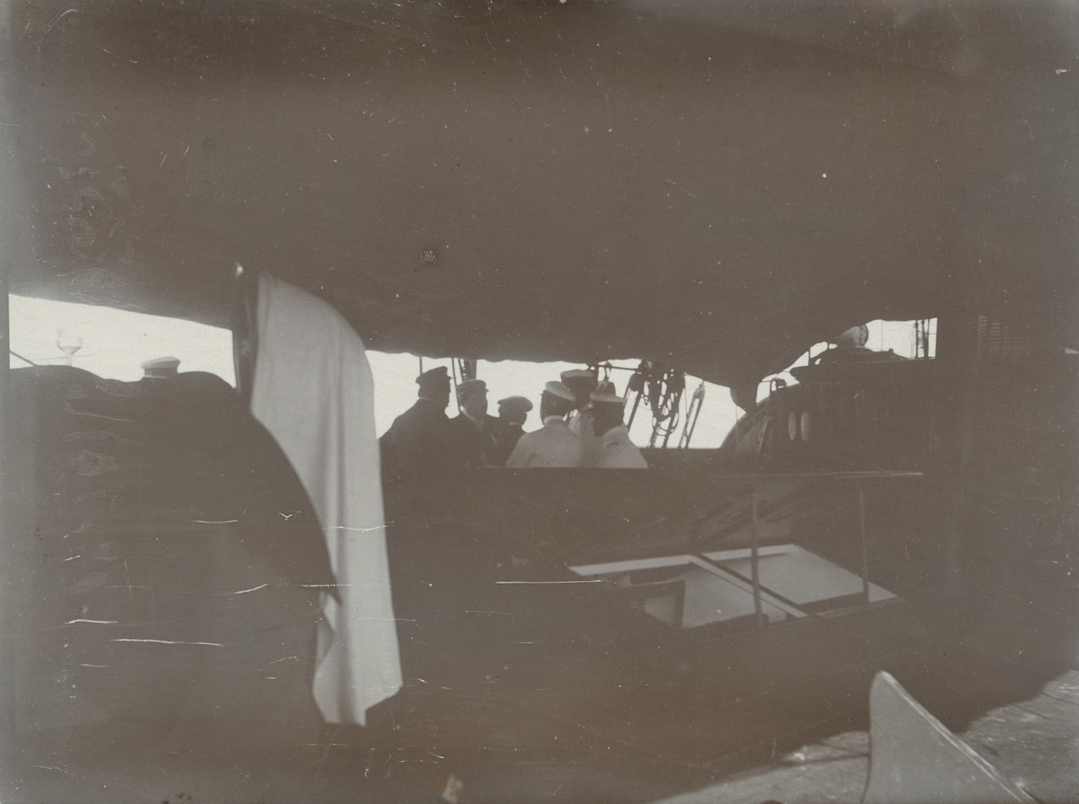 Fotografi från expedition till Grönland. Motiv av en grupp män, till synes sjöofficerer, som står och samtalar ombord på ett fartyg.