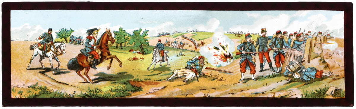 Titel: Målad bild på glas för skioptikon/laterna magica. Krigsbild.