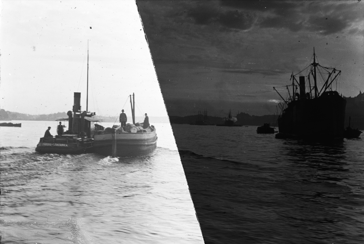 Skioptikonbild, ett experiment: Bilden på fartyg uppdelad i två halvor, ena halvan försvagad.