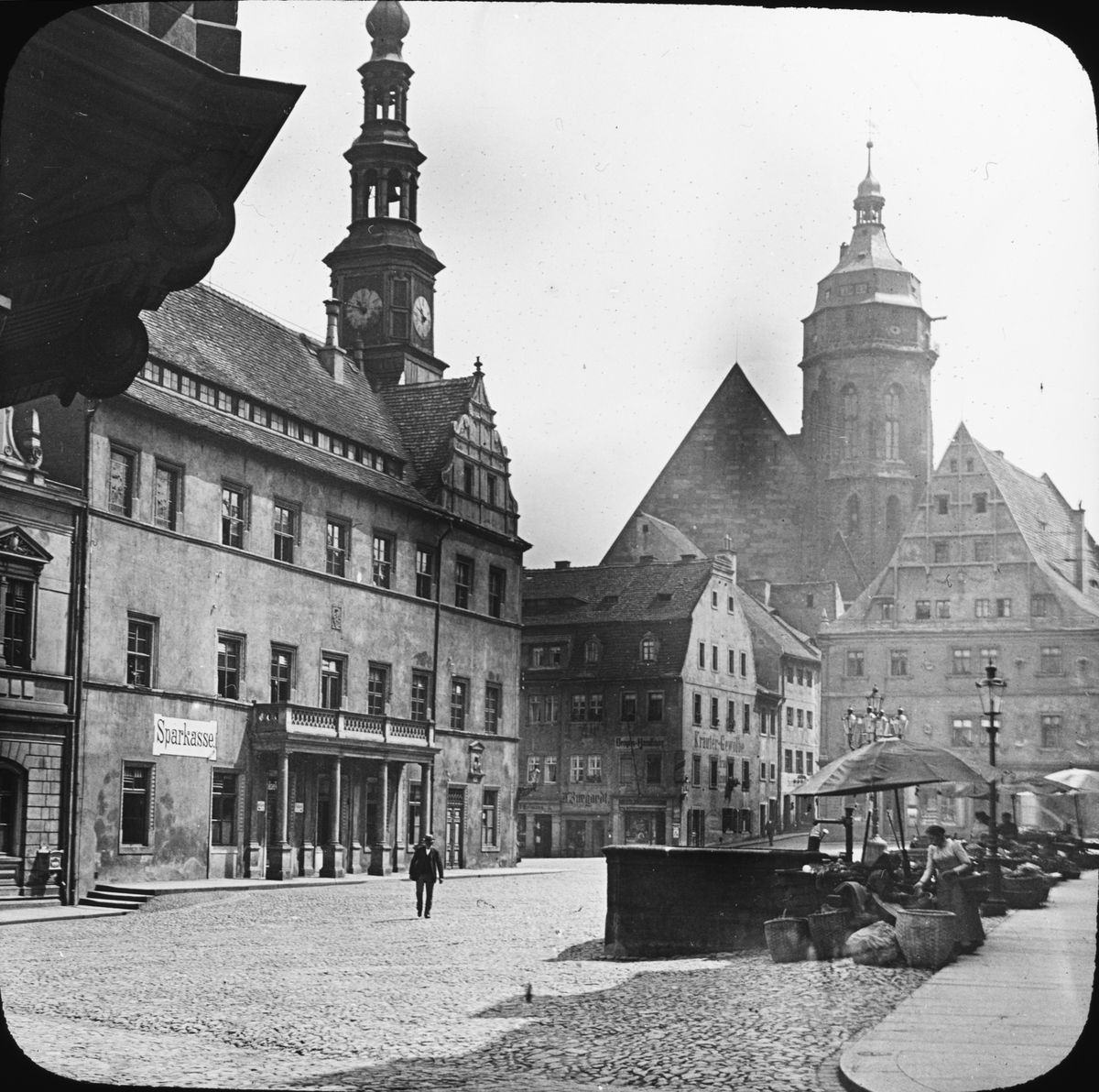 Skioptikonbild med motiv från Pirna med Marienkirche i bakgrunden.