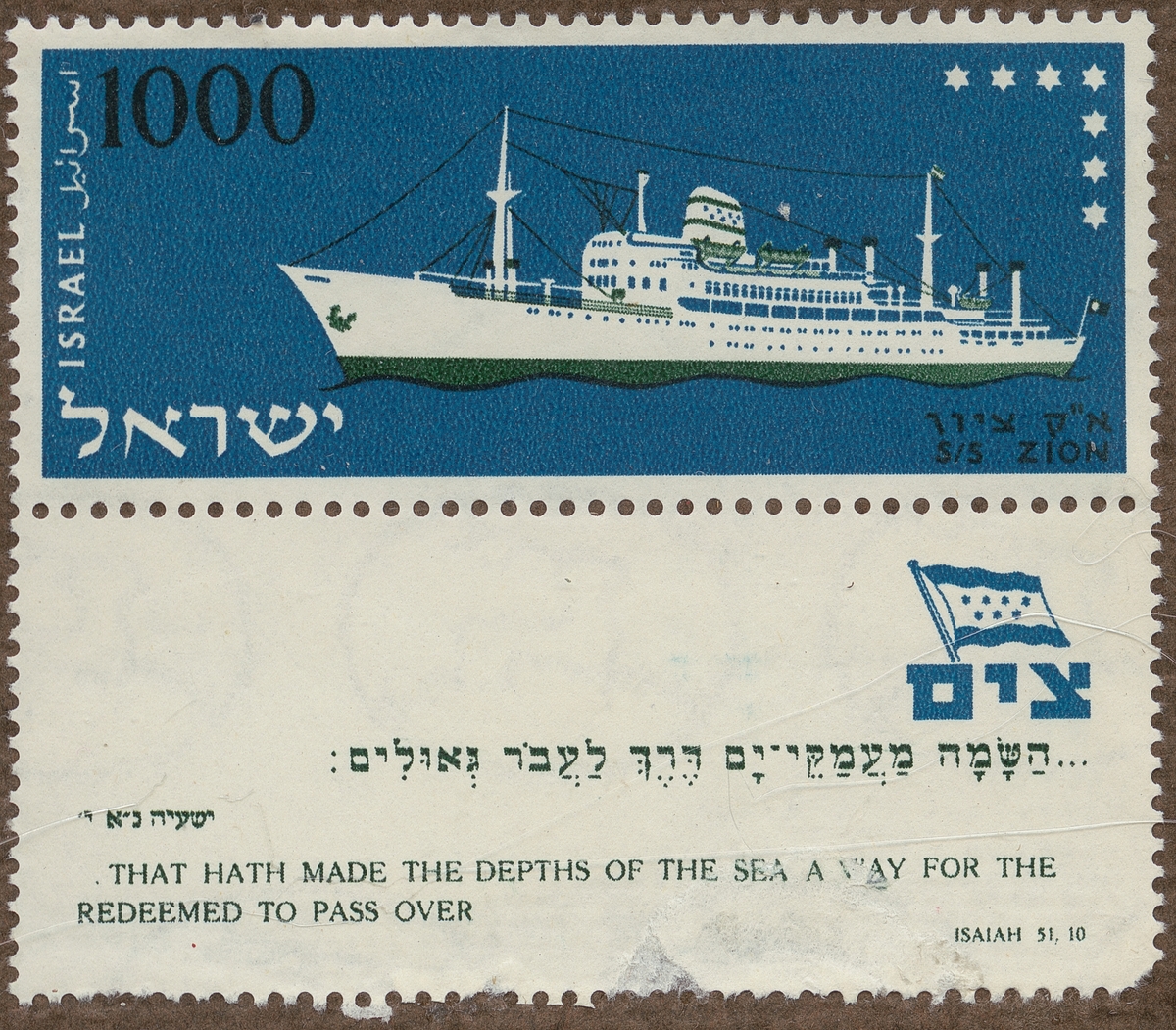Frimärke från Israel, 1957. Motiv av Atlantångaren S/S Zion "Esaias 51:10" "Serie: Israels Handelsflotta-"