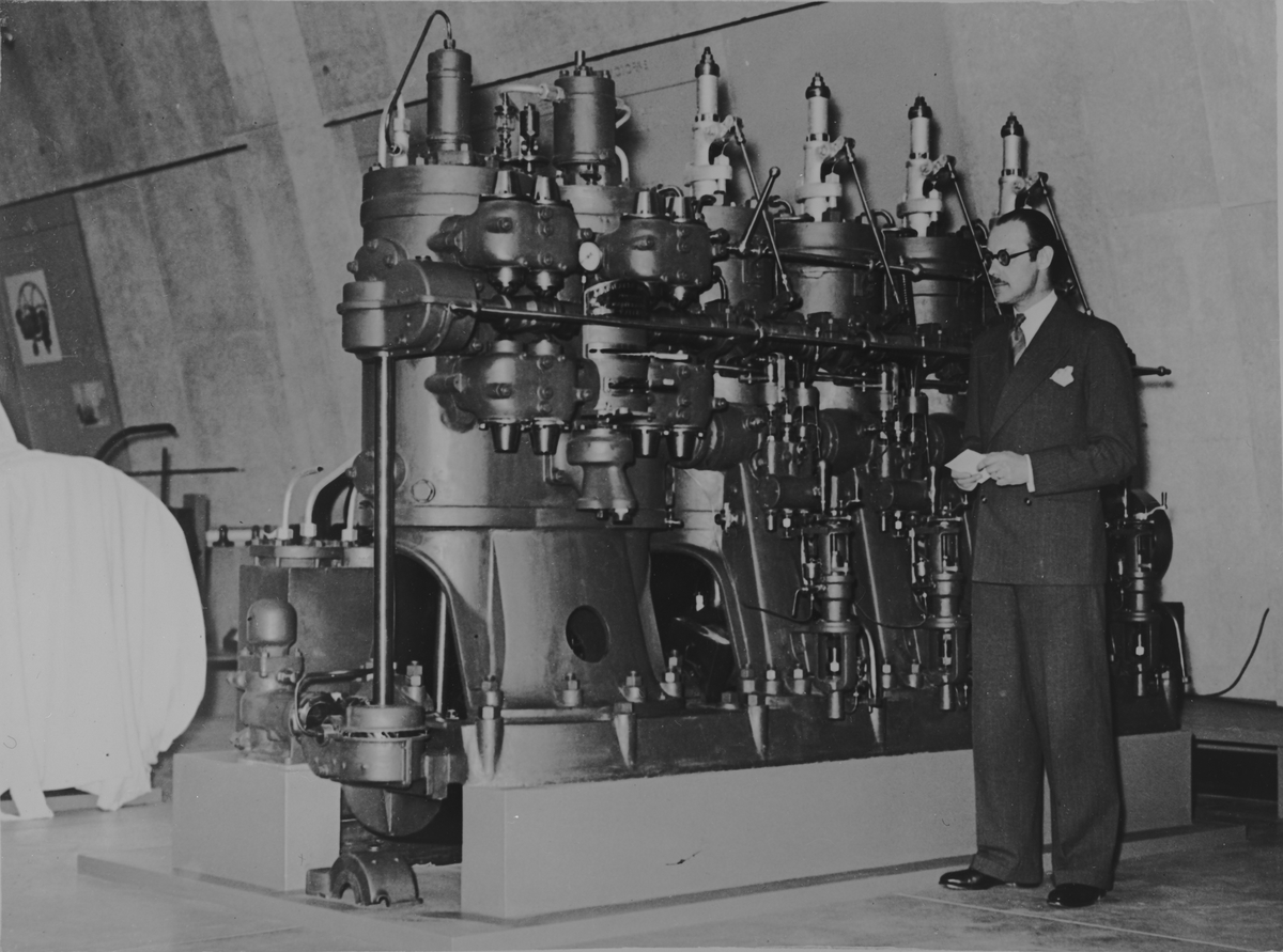 Intendent Torsten Althin vid den första dieselmotorn. Från invigningen av tekniska museets maskinhall