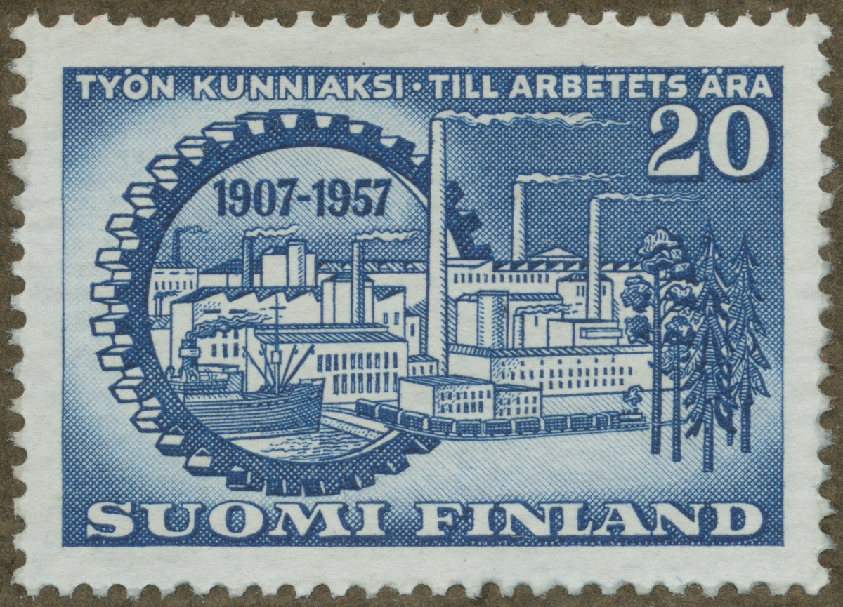 Frimärke ur Gösta Bodmans filatelistiska motivsamling, påbörjad 1950. Frimärke från Finland, 1957. Motiv av "Fabriksanläggningar Kugghjul - 'Till arbetets ära' 1907-1957."