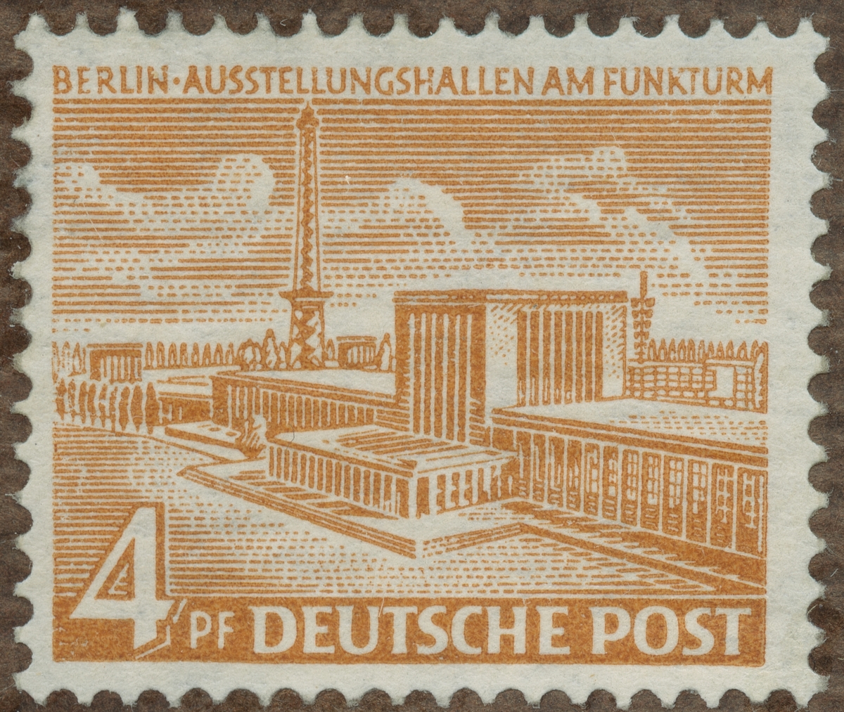 Frimärke från Tyskland, 1956. Motiv av Berlins Utställningshallar vid Radiomasten