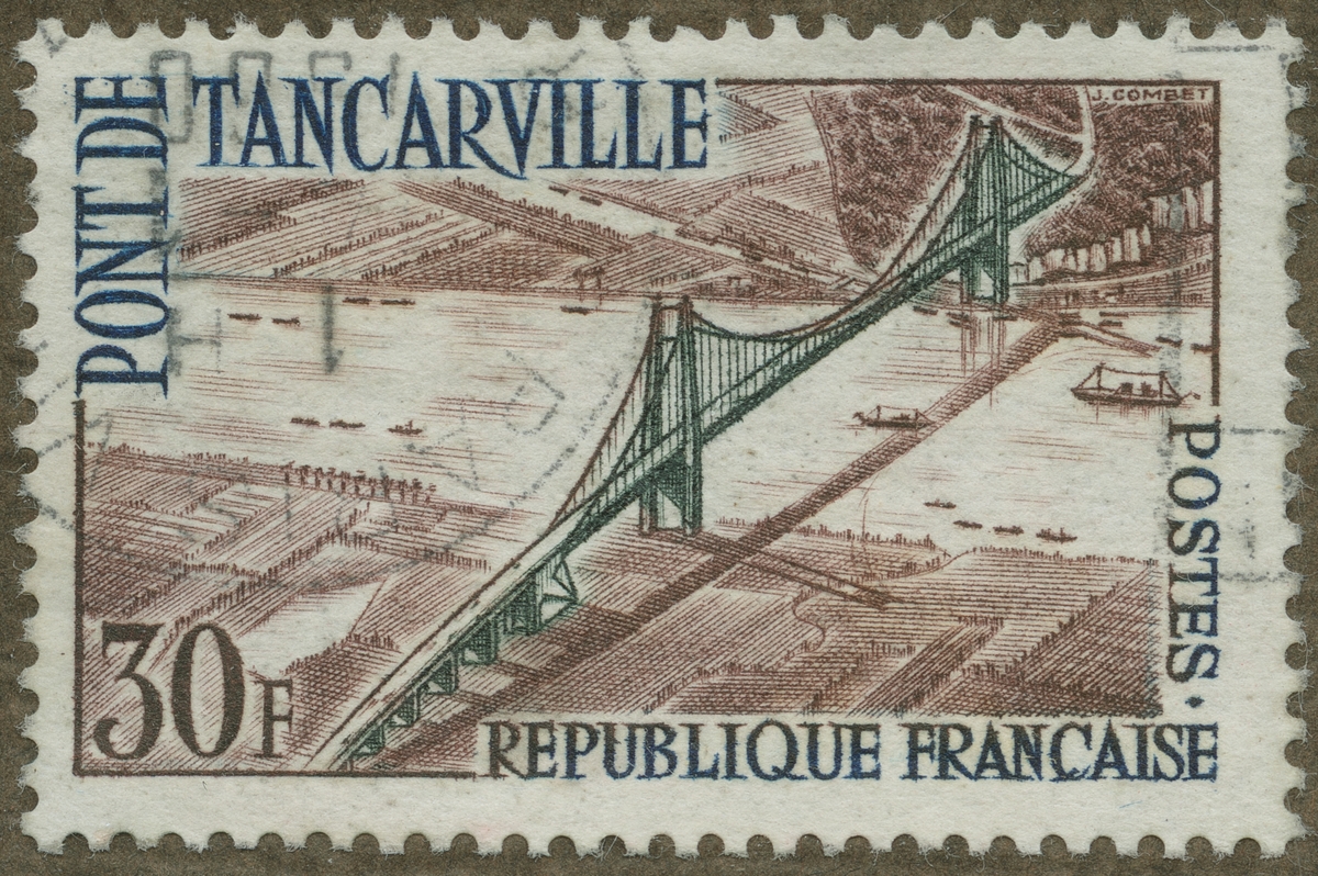Frimärke ur Gösta Bodmans filatelistiska motivsamling, påbörjad 1950. Frimärke från Frankrike, 1959. Motiv av Seine-flodens mynning vid Tancarville (Dept. Seine- Maritime)