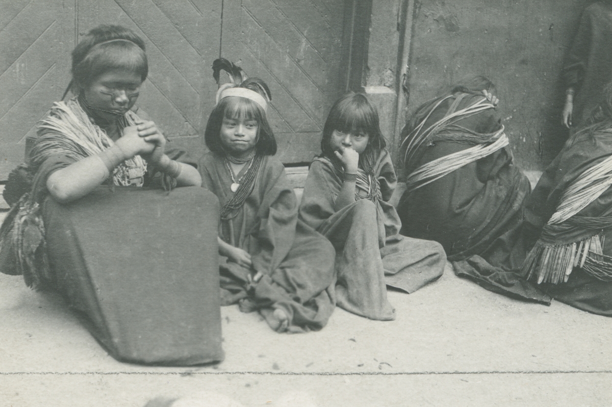 Fotografi från kuvert märkt med "Ernst Nordenskjöld". Motiv av kvinna och två flickor som sitter på marken. Kvinnan har ansiktsmålning och en av flickorna har fjädrar i håret.