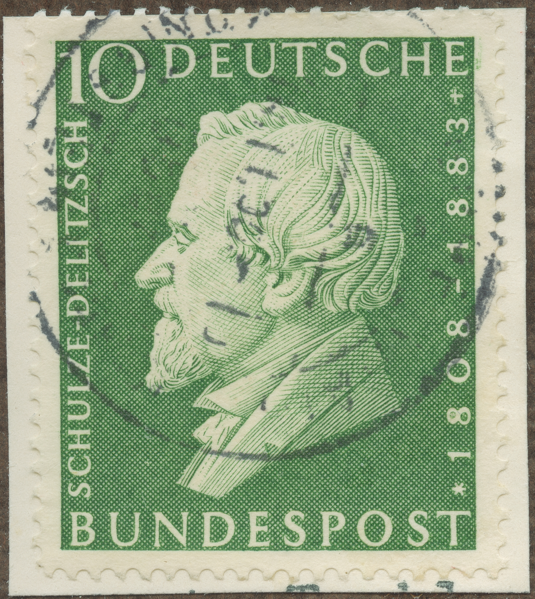 Frimärke från Västtyskland, 1958. Motiv av Franz Hermann Schulze-Delitzsch: 1808-1883. Initiativtagare till Tyska Kooperationen.