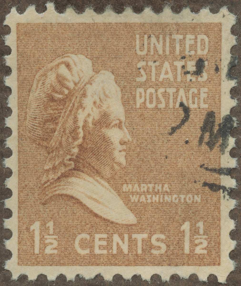 Frimärke från U.S.A, 1938. Motiv av Martha Washington Maka till George Washington: USA:s första president 1789-1797
