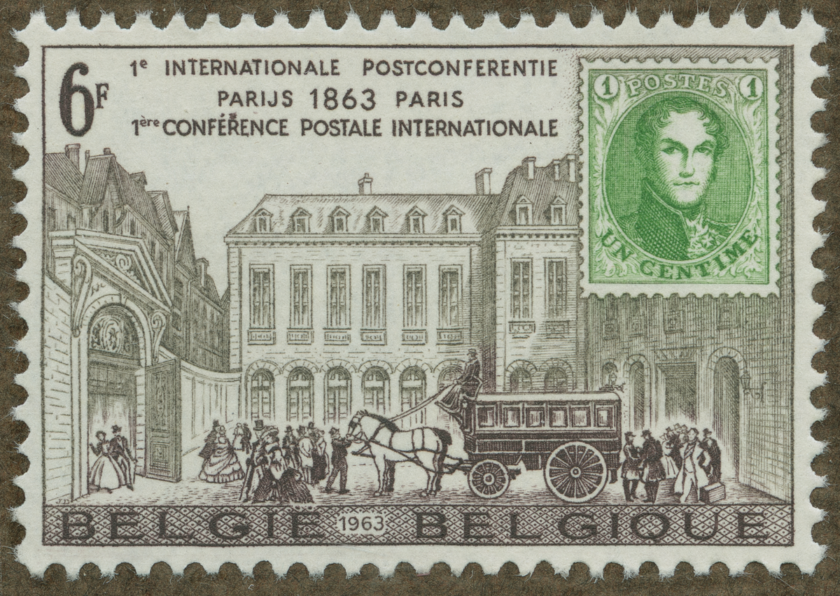 Frimärke från Belgien, 1963. Motiv av Förste internationella Postkongress i Paris 1863. Diligens. Stadsbild. 100-årsjubileum: 1863-1963.