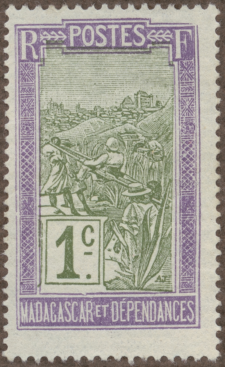 Frimärke ur Gösta Bodmans filatelistiska motivsamling, påbörjad 1950. Frimärke från Madagascar, 1908. Motiv av Transport i en slags bärstol "Bärare = människor"
